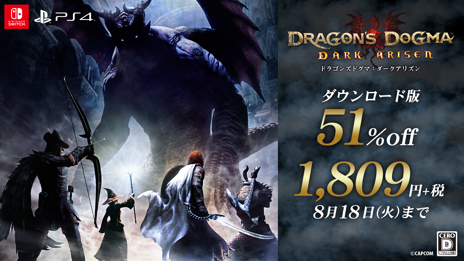 ドラゴンズドグマ 公式 Capcom Summer Sale August ドラゴンズドグマダークアリズン セール実施中 Ps4版 ニンテンドースイッチ版ともに 1 809 税 51 Off 期間限定でセール中 詳細はこちら T Co Qyamvxlmbb カプコンセール